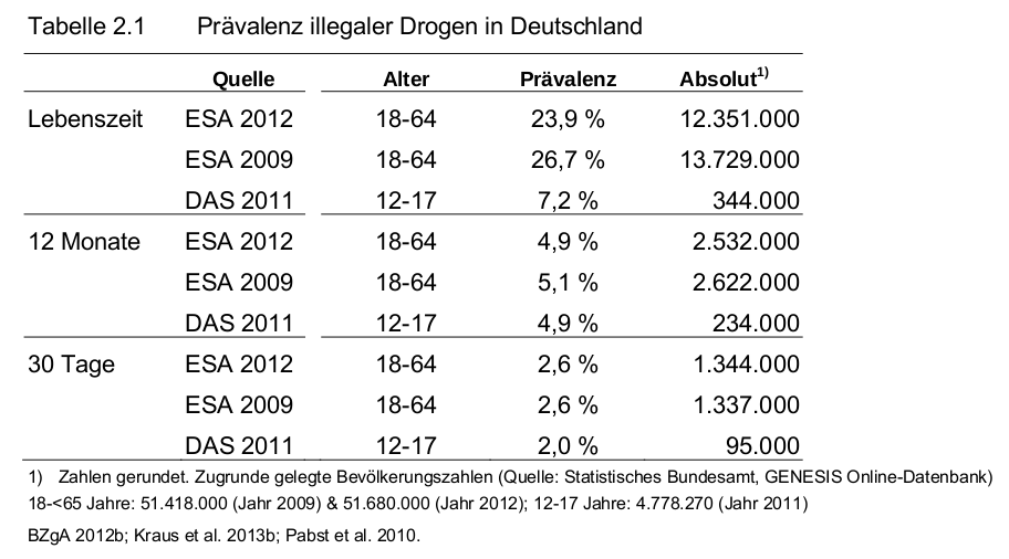 prävalenz2013ESA steht hierbei für Epidemiologische Suchtsurveys und DAS für die Drogenaffinitätsstudie der BZgA, mehr dazu im DBDD Bericht.